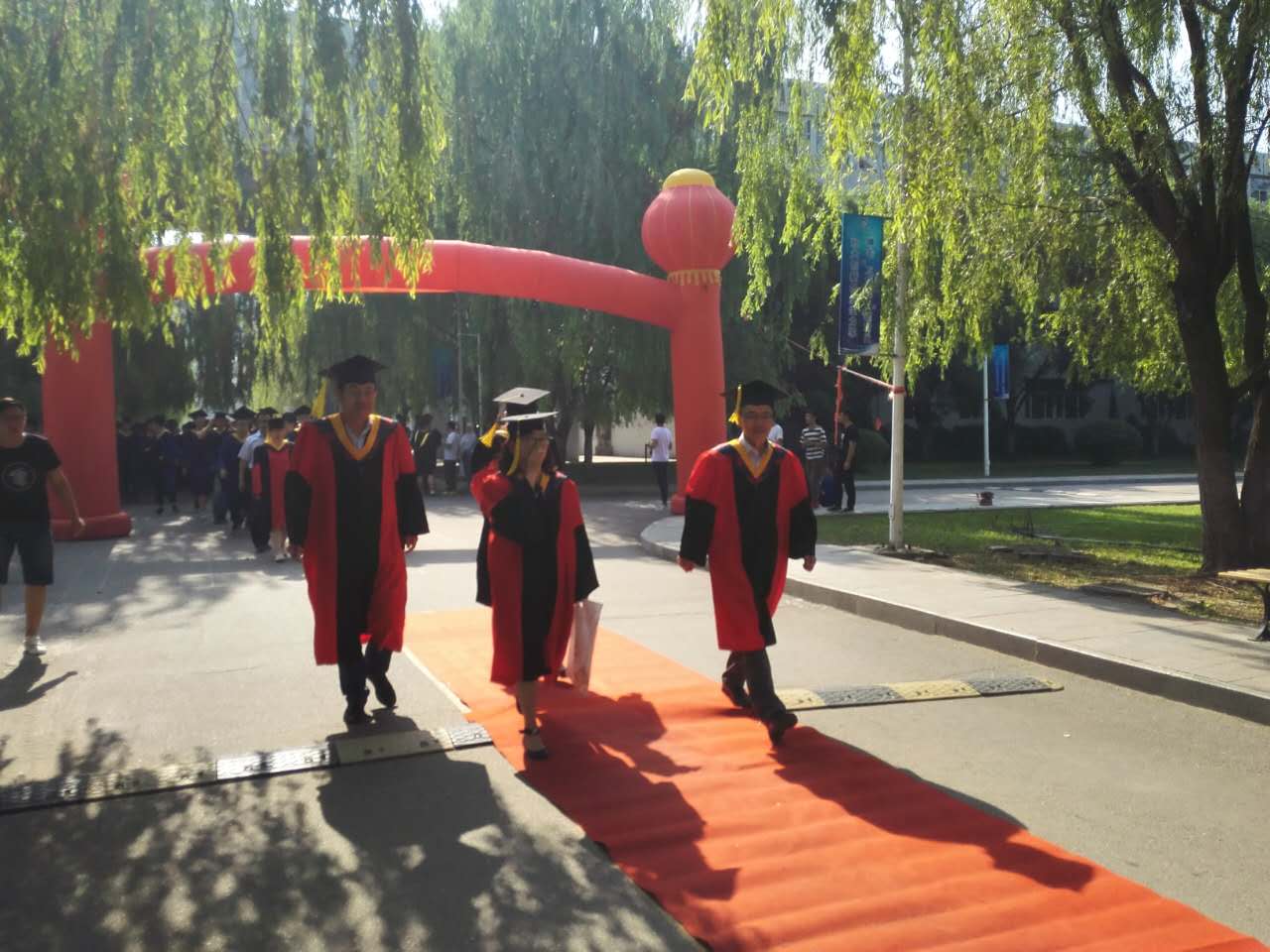 毕业典礼前,学院436名毕业生身穿学位服,踏着红地毯,在“这一路走来”的歌声中,穿过“社会主义核心价值观宣传长廊”、在“拒绝平庸追求卓越,百炼成钢”条幅上签下自己的名字,走向毕业典礼现场。学院用这种隆重而特殊仪式,为2017届毕业生送行,为材冶学院毕业生学业有成喝彩。这是我校第一个学院举办隆重毕业典礼